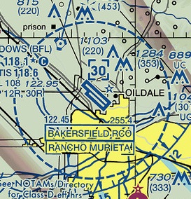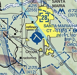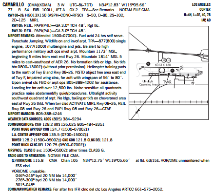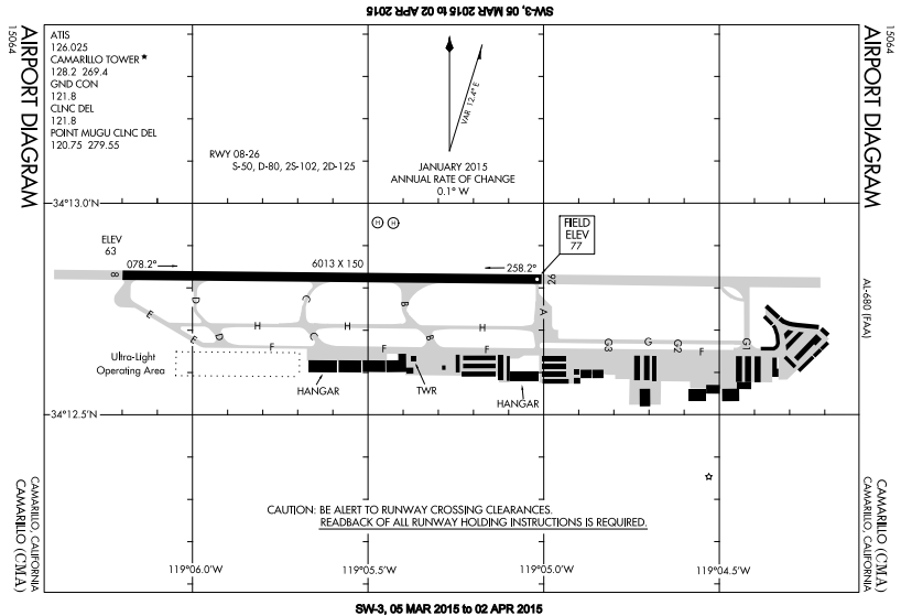 Examine the airport diagram for Camarillo. Note that frequency information, field elevation, runway length and width information is available. Taxiways are identified by letters and some buildings may be identified.