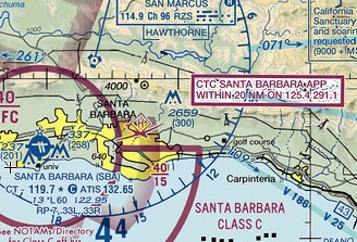 To obtain traffic advisories, you first need to determine the ATC facility and frequency for the airspace you are operating in. If you are operating near a Class C, Class B or TRSA, an airspace information boxes will be located around the airspace, with instructions to contact the controlling agency. In this case, pilot’s are encouraged to contact Santa Barbara Approach when operating with 20 NM of Santa Barbara Municipal.